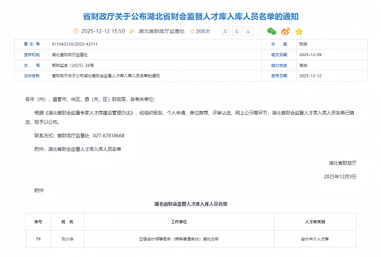 2025年12月12日,湖北省财政厅公布“湖北省财会监督专家人才库”入选名单,立信会计师事务所(特殊普通合伙)湖北分所审计风险管理部部门经理刘小华同志凭借其扎实的专业功底、丰富的执业经验与良好的行业声誉,经过个人申报与择优选拔,成功入选会计中介人才库。