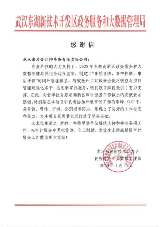 1月15日,武汉康力会计师事务所收到东湖新技术开发区政务服务和大数据管理局(以下简称“东湖政数局”)发来的感谢信。信中肯定了康力所2025年在东湖政数局审计服务工作中的突出贡献,同时点赞李峰、邓中平、吴雪黎、周伟、尹淇、孙玥琪等审计执业人员的专业表现。