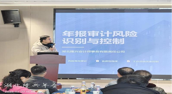 2026年2月7日,湖北隆兴会计师事务有限责任公司2025年总结表彰大会暨防控经营风险座谈会在武汉市武昌区石牌岭路130号宸胜中心顺利召开。本次大会以“务实高效、激励创新、共谋发展”为核心,全面总结了2025年度公司经营发展成果,表彰先进个人与团队,同时紧扣行业发展需求,开展审计与评估业务风险防控专题讲座,为2026年公司高质量发展谋篇布局。公司董事长胡铁宁、主任会计师吴定佳、各子公司及各部门负责人与全体员工齐聚一堂,共话过往成就,共迎新春佳节。