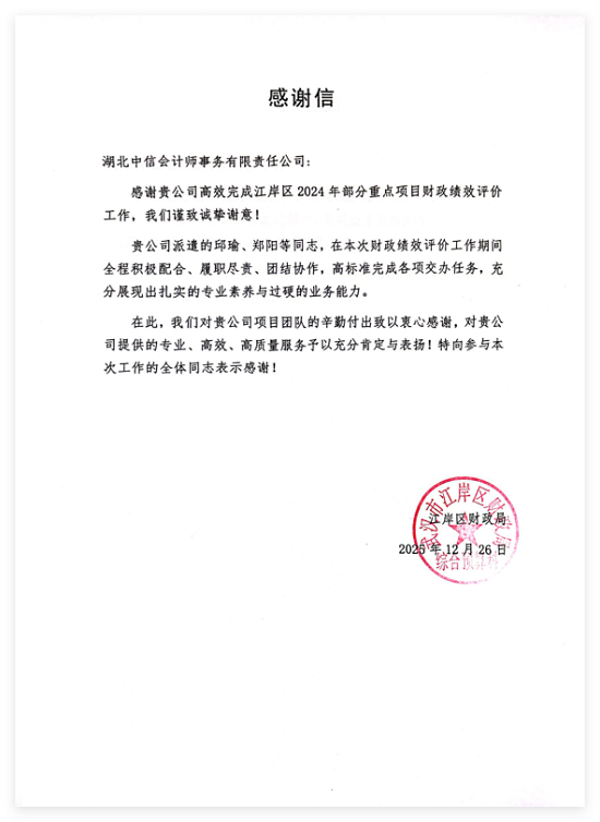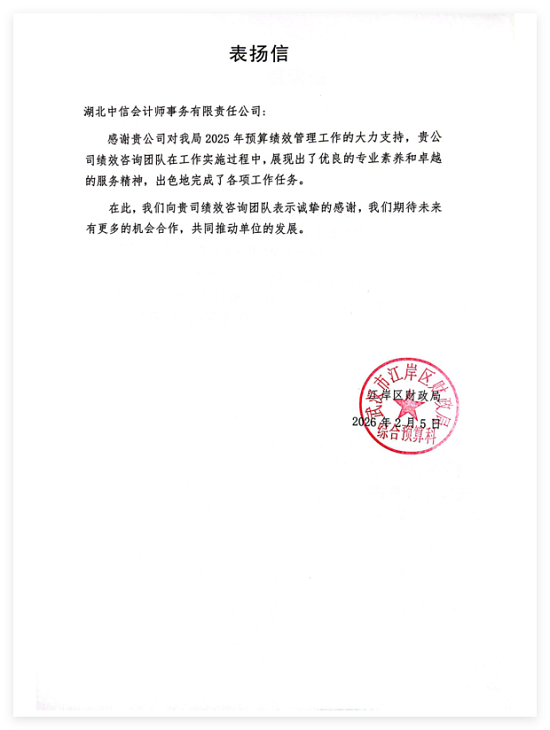 江岸区财政局在致中信所的感谢信中表示:“感谢贵公司对我局2025年预算绩效管理工作的大力支持,贵公司绩效咨询团队在工作实施过程中,展现出了优良的专业素养和卓越的服务精神,出色地完成了各项工作任务。在此,我们向贵司绩效咨询团队表示诚挚的感谢,我们期待未来有更多的机会合作,共同推动单位的发展。”